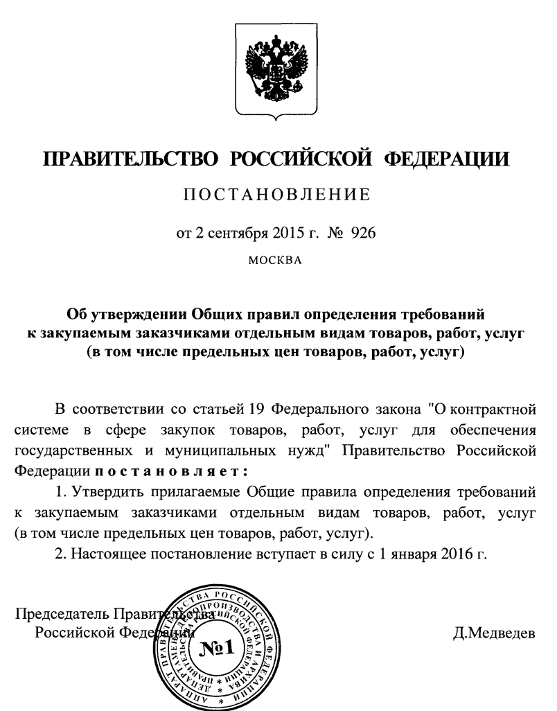Согласно постановлению правительства № 926 от 02.09.2015, утверждены общие правила определения требований к закупаемым заказчиками товарам, работам, услугам (ТРУ). На основании этого акта Министерства, администрации субъектов РФ, а также муниципальных образований разрабатывают следующие документы в пределах своих полномочий: