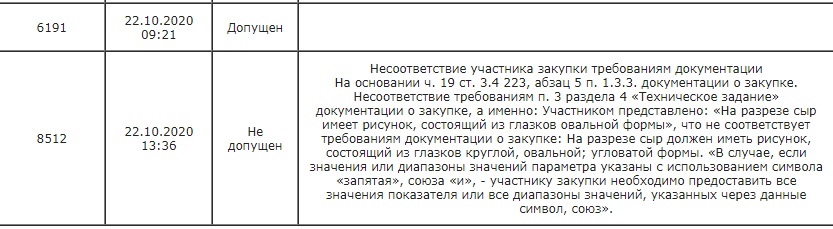Самое эпическое отклонение заявки приключилось в этом году в Башкортостане. Заказчик решил купить сливочного масла на 26 млн руб. и сыра на 8 млн руб. (закупка № 32009540827). На конкурс подали две заявки. Одну из них заказчик отклонил.