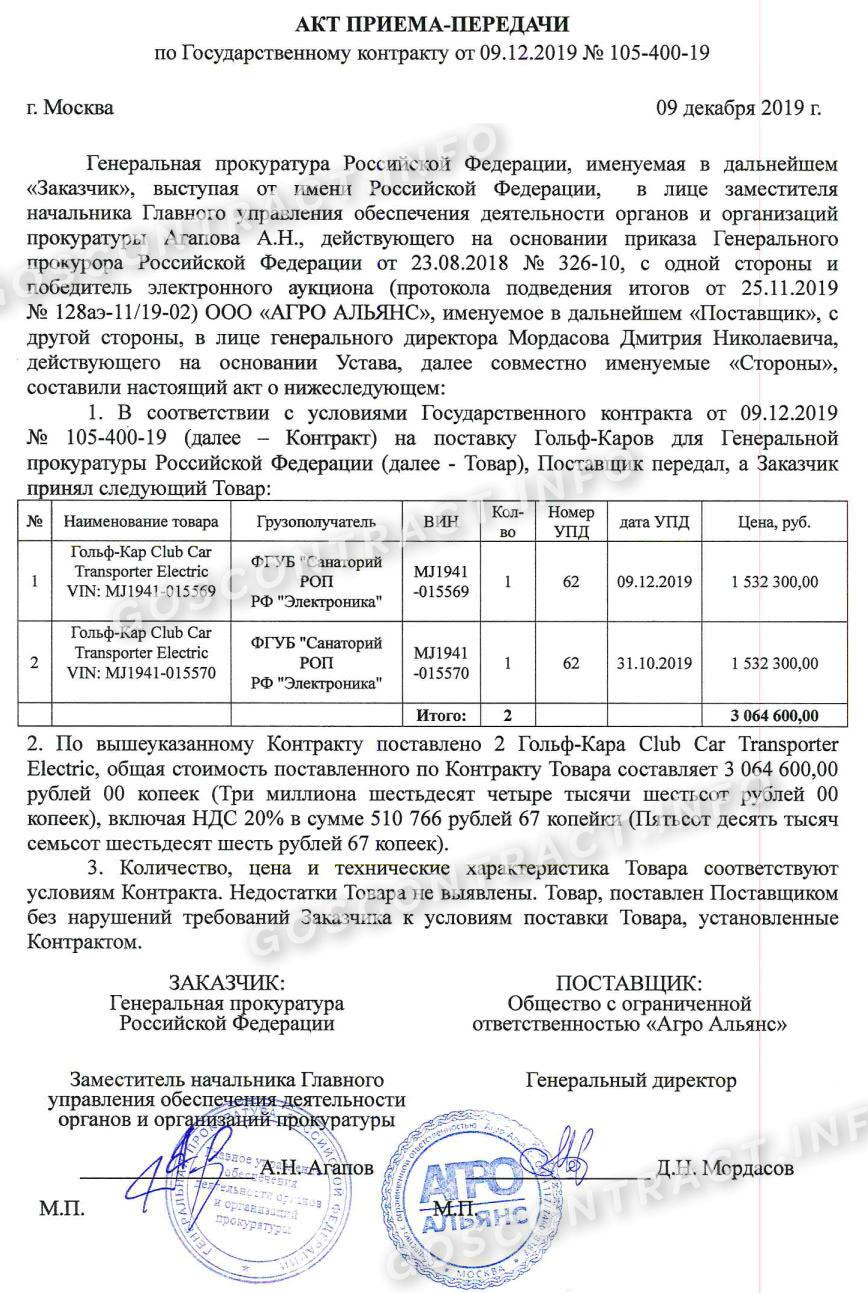 Генеральная прокуратура закупила 2 гольф-кара на общую сумму 3 064 000 рублей. Контракт заключили 09.12.2019 с обществом с ограниченной ответственностью «АГРО-АЛЬЯНС». А 24.12.2019 выложили акт-приема передачи гольф-каров Club Car Transporter Electric. По сведениям из ЕИС, гольф-кары для прокуратуры уже оплачены.