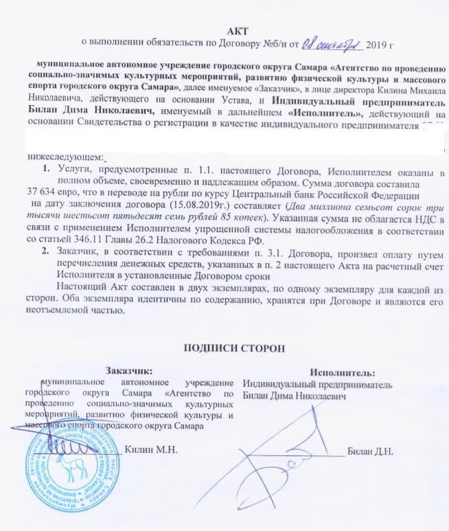 Скандальный концерт Димы Билана в Самаре закупили за 2,7 млн руб. Этот перформанс ко дню города заказало муниципальное учреждение «Агентство по проведению социально значимых культурных мероприятий, развитию физической культуры и массового спорта городского округа Самара». Договор заключили с индивидуальным предпринимателем Билан Дима Николаевич.