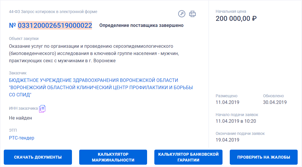 В апреле управление по регулированию контрактной системы в сфере закупок Воронежской области объявило закупку №0131200001020003565 на оказание услуг по организации и проведению сероэпидемиологического (биоповеденческого) исследования в ключевой группе населения — мужчин, которые практикуют секс с мужчинами, в г. Воронеже.