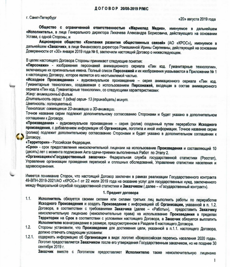 Для исполнения оно привлекло общество с ограниченной ответственностью «Мармелад Медиа» и заключило с ним договор на 7,5 млн рублей за создание одной серии мультфильма «Смешарики» с рекламой переписи.