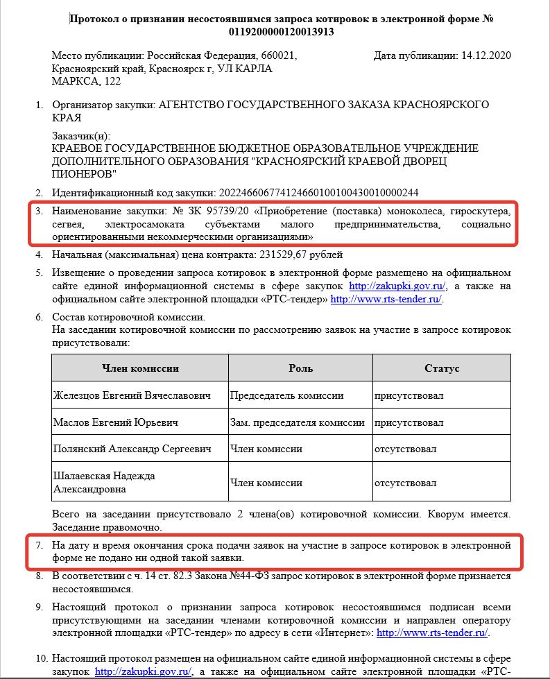Еще пример: поставка моноколеса, гироскутера, сегвея, электросамоката в декабре прошлого года в Красноярский краевой дворец пионеров. В этой закупке не было претендентов от слова совсем.
