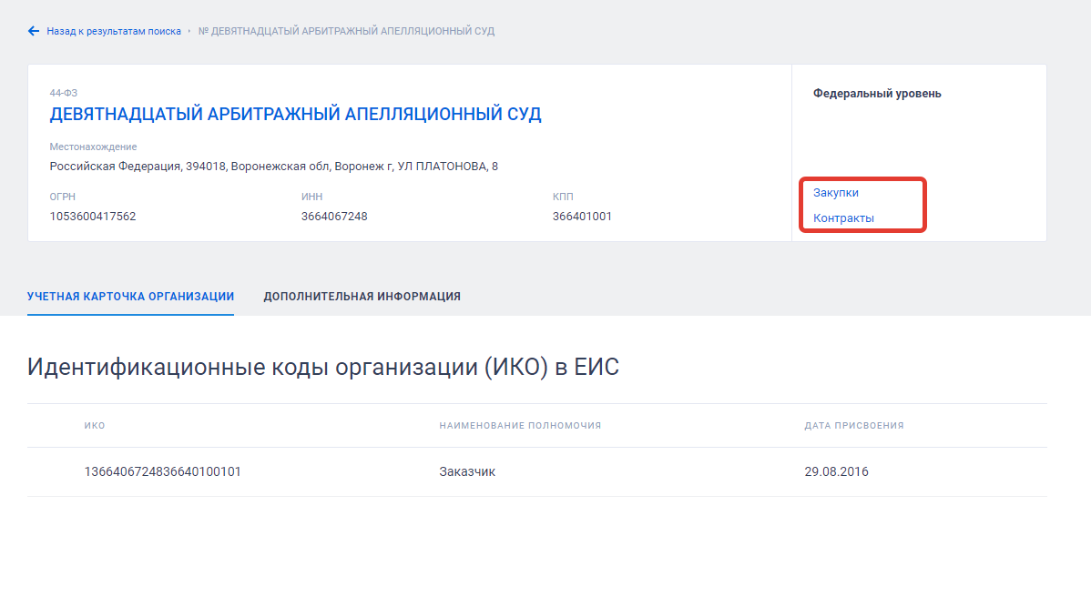 Открываем регистрационные данные заказчика, и справа есть ссылка на все закупки и контракты, которые он проводил и заключал.