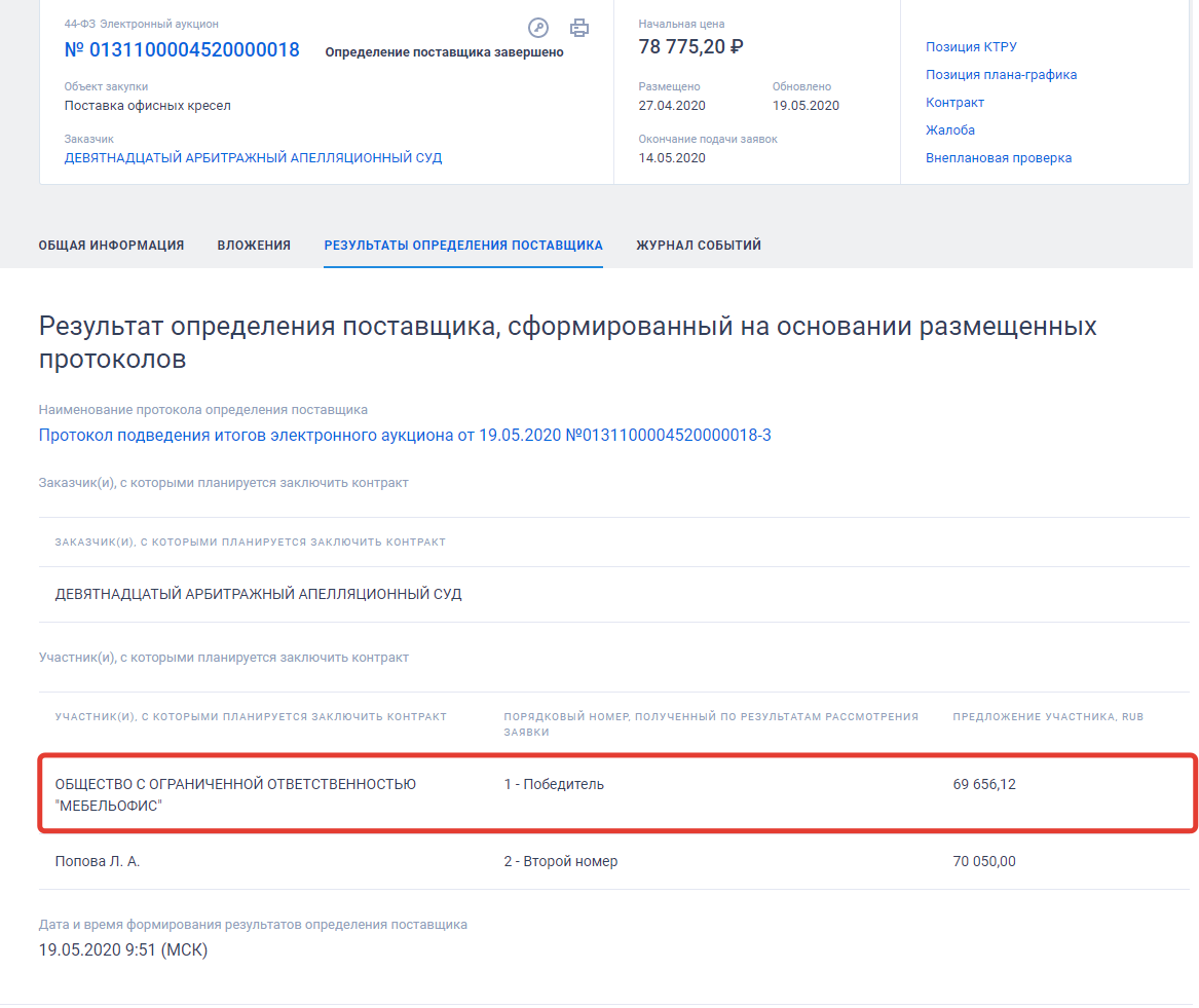 Анализ показывает, что в апреле 2020 года Девятнадцатый арбитражный апелляционный суд заказывал кресла. Победителем стало ООО «Мебельофис», которое снизило цену с 78 775,20 рублей до 69 656,12 рублей, т. е. на 11% от НМЦК.