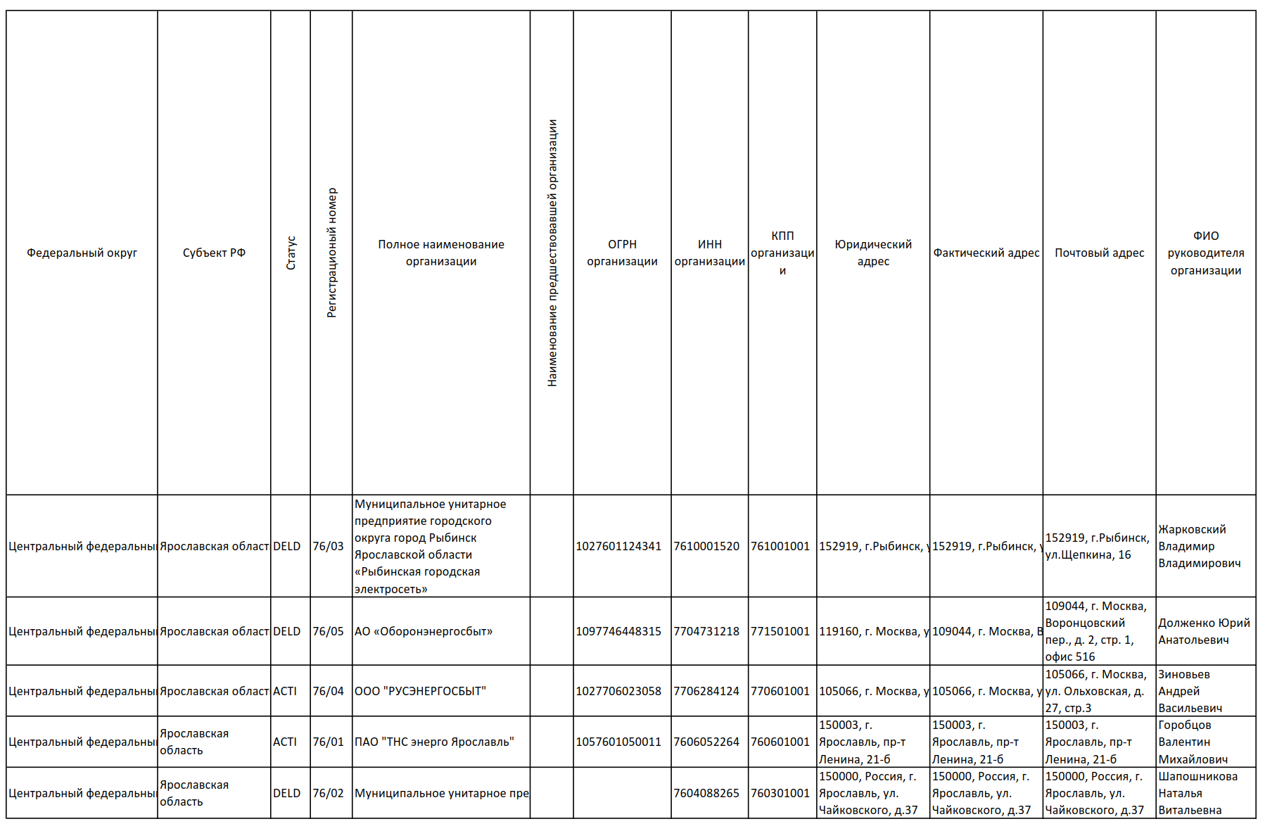 Список субъектов естественных монополий по состоянию на 01.04.2019