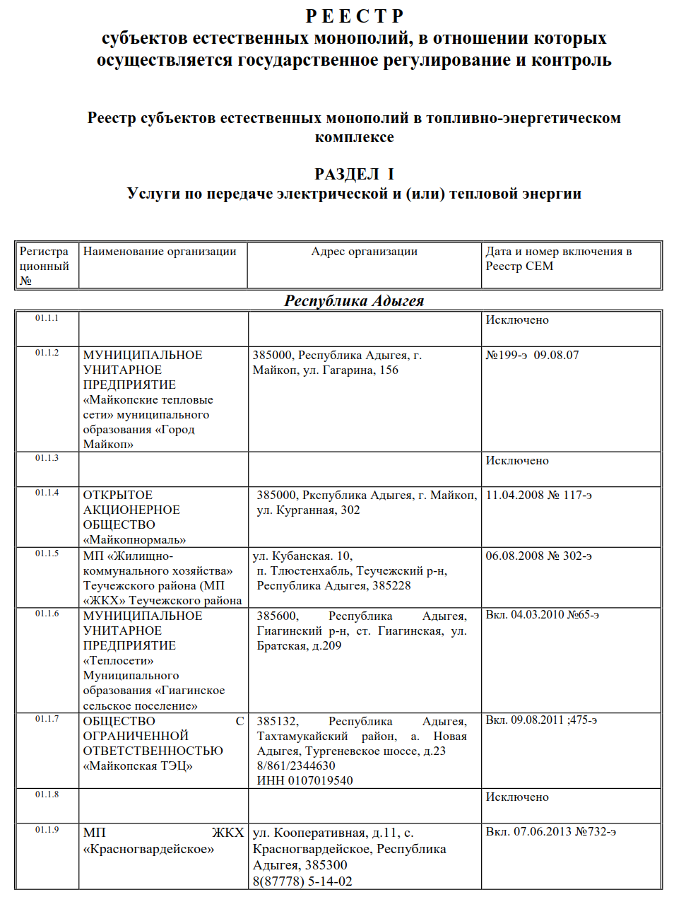 - Список субъектов естественных монополий по состоянию на 01.04.2019
