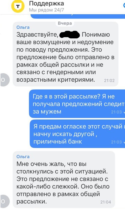 «Я нахожусь в некотором недоумении, обескуражена и даже чувствую гендерное унижение, потому что я не получила такого предложения от Т-Банка — следить за своим мужем», — написала мне читательница.