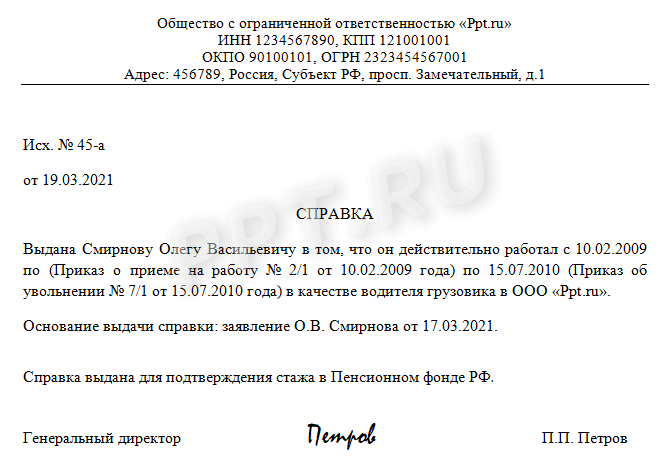 _______________ №___________ _______________ от___________ СПРАВКА Выдана ___________________ (Ф.И.О. получателя) в том, что он (она) действительно работал(а) с __________________ (Приказ о приеме на работу № __ от ________ года) по ______________________________________ (Приказ об увольнении № __ от ________ года) в качестве ________________________ (наименование должности) в _________________________________ (наименование работодателя). Основание выдачи: заявление. Справка выдана для подтверждения стажа в Пенсионном фонде РФ. Руководитель (подпись) |