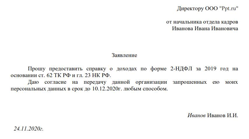 Нормативно-правовыми актами не урегулировано заявление о выдаче справки 2-НДФЛ работнику в новом формате, высказать запрос разрешается и в устной форме. Но нормы НК РФ и ТК РФ регулируют сроки информирования сотрудников о доходах, поэтому большинство работодателей предпочитает письменный запрос устному.