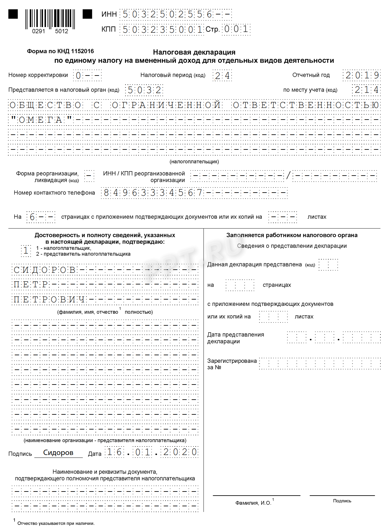 - если код ОКТМО меньше 11 знаков, то порядок заполнения декларации по ЕНВД требует заполнять ячейки слева направо, а в клетках, где пустые знакоместа, — ставить прочерки (25003451– – –). То же самое касается ИНН;