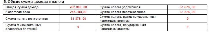 А вот из раздела 4 справки 2-НДФЛ удалили упоминание об инвестиционных вычетах. Теперь он называется «Стандартные, социальные и имущественные вычеты». При заполнении нужно указывать код вычета и сумму. Ниже нужно проинформировать налоговый орган об уведомлении о праве на социальный вычет (если такие были). Если у плательщика есть право на получение инвестиционного вычета, он по-прежнему может воспользоваться им в соответствии с п. 1 статьи 219.1 НК РФ. Хотя отдельного упоминания о нем нет в названии раздела, его код не изменился — «619». Особенностей при указании сумм не предусмотрено. В конце все данные по доходам суммируются, и приводится сумма удержанного налога. Для этого предназначен раздел 5: