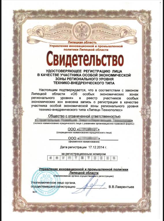 Вот примерный образец свидетельства участника ОЭЗ: