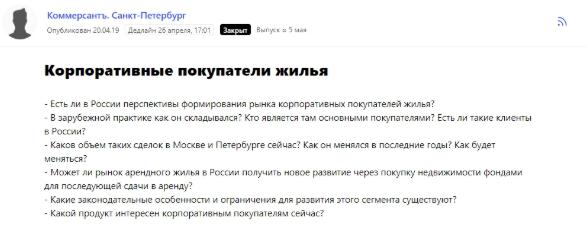 Также удавалось сотрудничать с региональным «Коммерсантом». Редакция искала экспертов, которые ответят на вопросы о покупке жилья для корпоративных нужд.