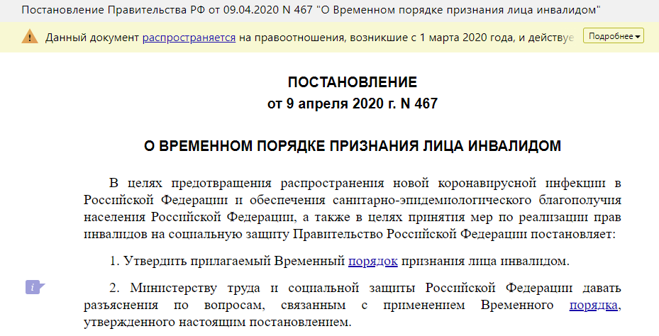 В рамках мероприятий по противодействию распространению коронавирусной инфекции весной 2020 года ввели упрощенный порядок прохождения МСЭ как для тех граждан, которые обращаются для установления инвалидности в первый раз, так и для тех, кто проходит медико-социальную экспертизу повторно. Аналогичные правила действуют для детей-инвалидов. Как пояснил министр труда и социальной защиты Антон Котяков: