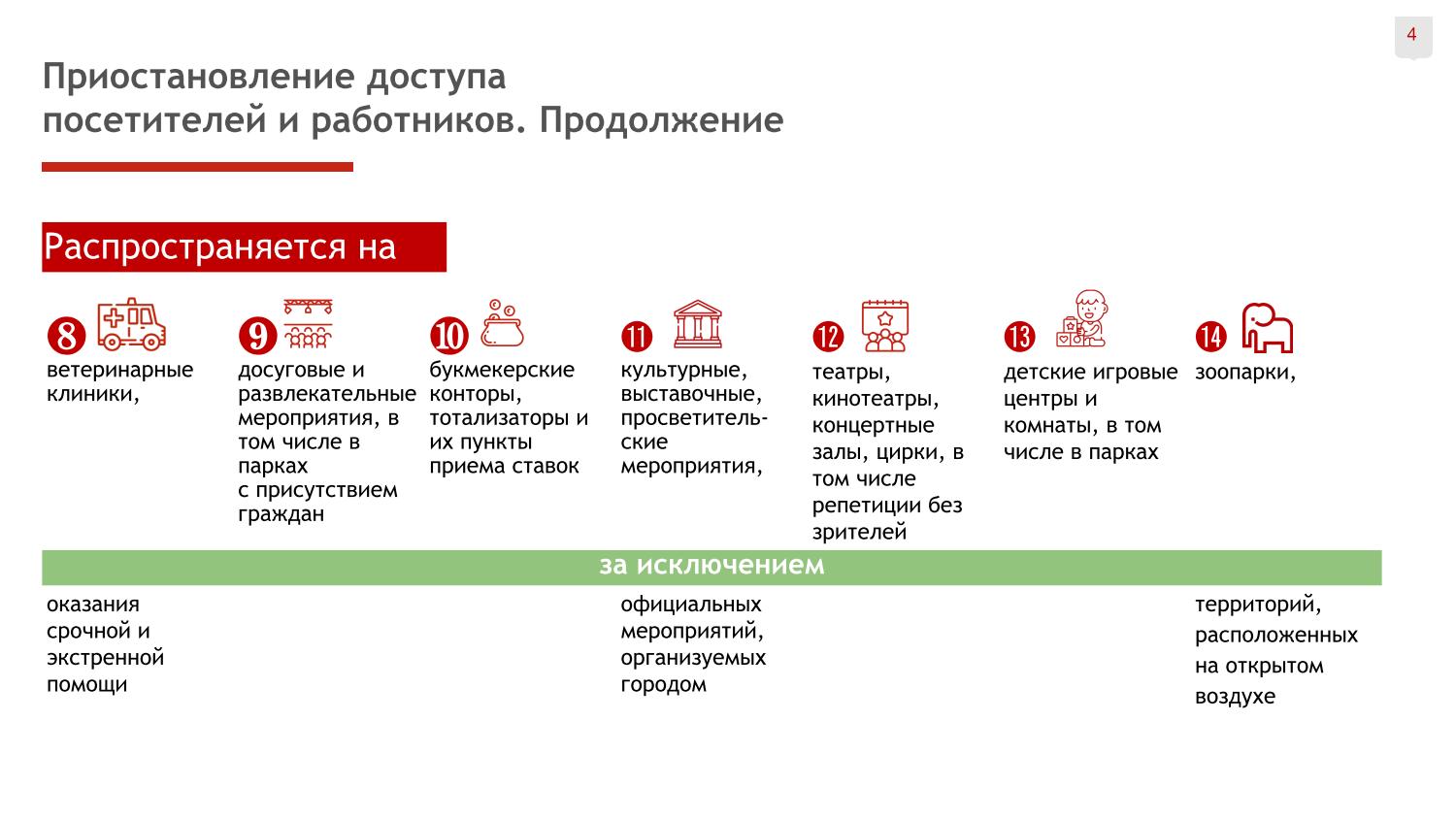 Под запрет попадут массовые спортивные, развлекательные и культурные мероприятия. Продолжат работать: