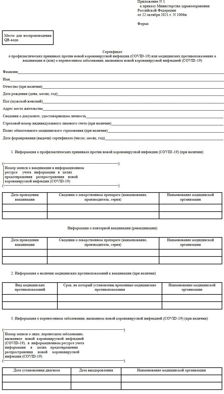 Приказом Министерства здравоохранения Российской Федерации от 22.10.2021 № 1006н утверждена новая форма сертификата, оформляемого гражданам, которые вакцинированы от коронавируса, переболели им или имеют медотвод от вакцинации.