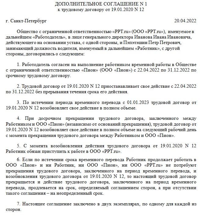 - После подписания дополнительного соглашения о приостановке основного трудового договора и согласия работодателя о временном переводе работника к другому работодателю работник заключает временный контракт с другой компанией.