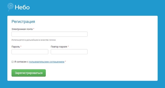 Процедура регистрации в Небе — типовая для интернет-сервисов. Нужно зайти на сайт Неба и нажать в верхнем меню кнопку "Регистрация". Откроется форма, которую нужно заполнить: