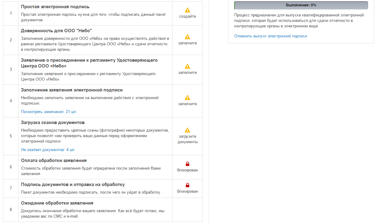 - Нужно выполнить все ожидаемые сервисом действия — от заполнения заявки до загрузки сканов документов и оплаты. После этого нужно будет дождаться выпуска сертификата ключа. Обычно это занимает 1 день, иногда чуть дольше. Уведомление о готовности Небо присылает по электронной почте и СМС.